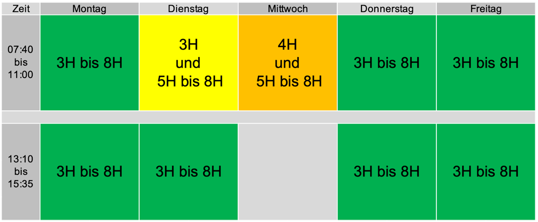 Die Unterrichtszeiten für die 5H bis 8H bleiben unverändert. Das Alternieren der 3H und 4H erfolgt neu am Dienstag bzw. Mittwoch.