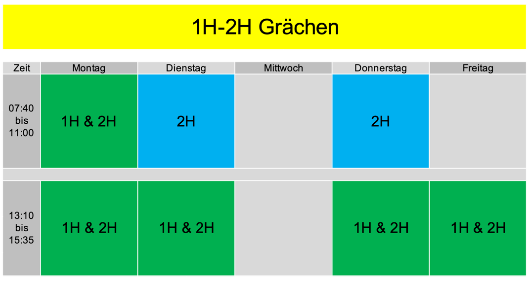 Aufgrund der aktuellen Schülerzahlen müssen die Unterrichtszeiten der 1-2H in Grächen für das nächste Schuljahr angepasst werden.